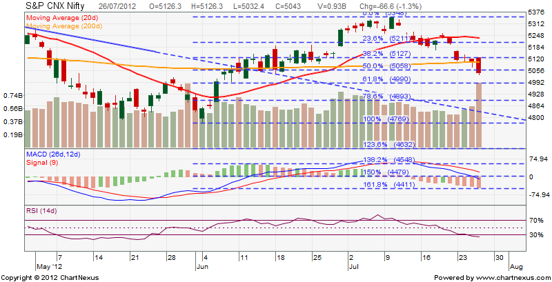 Today was the last trading day of this month so I thought of adding Nifty monthly chart. Nifty is trading within a triangle and this is clearly visible in monthly chart. The trading range of Nifty in the month of July was between 5079-5350. If we connect 5628-5350 we arrive at a trend line which is nothing but upper part of the triangle. My anticipation for the month of August is that Nifty may reach 5300 and in best case scenario it may move up to 5400 .After reaching these levels it may drift down towards 5000 once again.